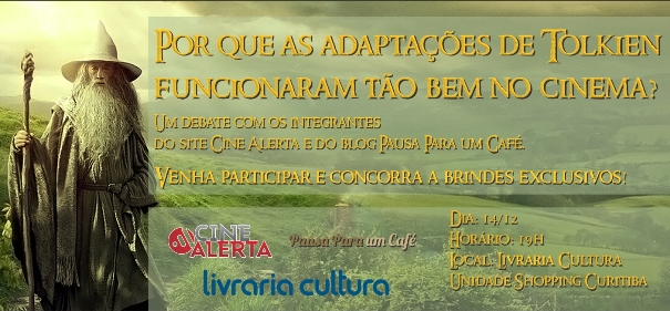 Em dezembro estreia a primeira parte da Trilogia O Hobbit e para comemorar, O Cine Alerta, Livraria Cultura e o blog Pausa para um Café convidam você a participar de um debate sobre as adaptações cinematográficas da obra de Tolkien no dia 14 de dezembro as 19 horas, com as presenças de Tiago Batista, Alexandre Luiz, Warley Bonanno e Anna Schermak. O evento acontecerá na Livraria Cultura - Unidade Shopping Curitiba.