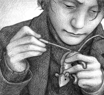 A pele da cauda foi removida, revelando a estrutura esquelética da cobra e o funcionamento interno do animatrônico.
